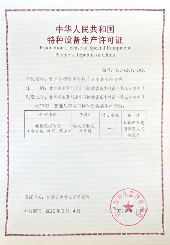 此次取證工作自2022年3月底開始至今,裝備公司在人員、技術(shù)、設備、原材料等方面為康甲公司提供了全面支持,為取得特種設備生產(chǎn)許可奠定了基礎。康甲公司各部門通力協(xié)作,完成質(zhì)量保證體系建設,并嚴格按照質(zhì)量保證體系要求完成塔式起重機和施工升降機的試生產(chǎn),專家組從資源條件、體系運行、試生產(chǎn)等三個方面進行了評審,經(jīng)甘肅省市場監(jiān)督管理局復核相關資料,按照相關法律法規(guī)決定授予康甲公司特種設備生產(chǎn)許可證。