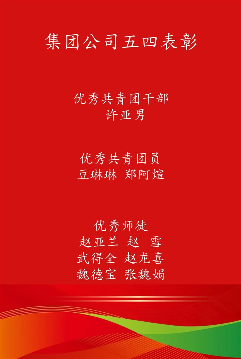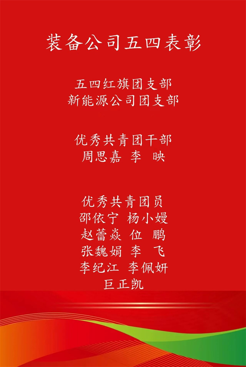 為表彰先進(jìn)、樹立典型、激勵各團(tuán)支部和廣大團(tuán)員青年向先進(jìn)學(xué)習(xí)、向優(yōu)秀看齊,裝備公司團(tuán)委決定授予新能源公司團(tuán)支部“五四紅旗團(tuán)支部”榮譽稱號;授予邵依寧同志、楊小嫚同志、趙蕾焱同志、位鵬同志、張魏娟同志、李飛同志、李紀(jì)江同志、李佩妍同志、巨正凱同志9名同志“優(yōu)秀共青團(tuán)員”榮譽稱號;授予李映同志、周思嘉同志“優(yōu)秀共青團(tuán)干部”榮譽稱號。