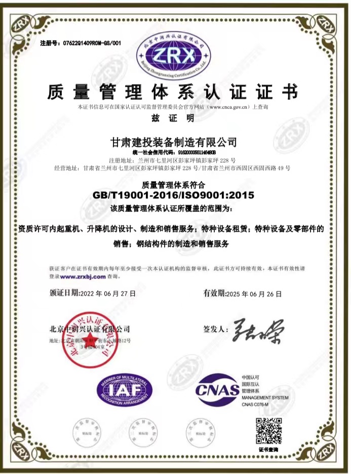 這一喜訊證明裝備公司已經(jīng)建立符合ISO9001:2008、GB/T19001-2008的認(rèn)證標(biāo)準(zhǔn)的質(zhì)量管理體系,起重機(jī)、升降機(jī)的設(shè)計(jì)制造,特種設(shè)備租賃及零部件銷售,鋼結(jié)構(gòu)件的制造和銷售服務(wù)等順利通過認(rèn)證。