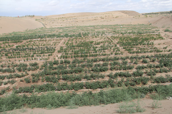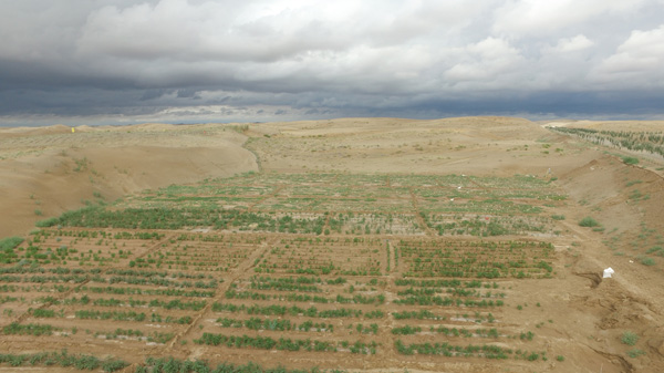 “起床了,起床了,天快亮了……” 一座土炕上,八個小伙子擠在一起睡著。隨著陣陣叫喊聲,小伙們睜開惺忪的睡眼,有點不情愿,但又都麻利的起身穿衣。屋外寒風陣陣,一離開被窩冷風便從門縫、窗口往身上鉆…… 簡單洗漱后,不用安排,做飯的做飯,收拾的收拾,一切準備就緒后七點半準時出發(fā),奔赴每天要去的沙漠試驗點。 小伙們擠在一輛并不算完善,既是代步工具,又是試驗對象的立體固沙車后備草料箱里。雖然冷的發(fā)抖,但心里還都沾沾自喜,因為在周邊老百姓眼里,這是一輛神奇的車,一輛可以自動治沙的機器。一輛由他們和他們身后團隊自主研發(fā)制造的治沙車。 當然,沾沾自喜總是要付出“代價”的,沒走出兩公里,車熄火了。原因大家都清楚,機油被凍住了,之前零號機油加太多了,沒考慮到這里的冬天會這么冷。拿出備好的柴火,兼職司機 “潘師傅”開始給機油“解凍”…… 到達目的地的時間只比往常晚了二十來分鐘。今天的工作是繼續(xù)試驗固沙車出草不順暢的問題,同時還要分出一部分人,在試驗草沙障內(nèi)種植一種常見的沙生植物“梭梭”,確保在冬雪來臨時,給梭梭足夠的水分。 8個人分工明確,試驗的試驗,測算的測算,記錄的記錄,種植的種植,中午隨便吃點大餅咸菜,下午接著干。大家都卯著勁,因為手頭的活不是常規(guī)工作,這一天出來就要有一天的成果,晚上要把試驗數(shù)據(jù)帶回去,繼續(xù)對固沙車出草結(jié)構(gòu)進行分析改進。下午6點鐘,天已微微變黑,8個人繼續(xù)坐著這輛“獨一無二”的治沙車回農(nóng)家院…… 這是2014年11月,武威市涼州區(qū)九墩灘騰格里沙漠邊緣,甘肅建投新能源公司工程與生物治沙試驗基地的一天。 ?。ㄒ唬? 2014年10月8日,從西北師范大學(xué)環(huán)境生態(tài)專業(yè)畢業(yè)的碩士研究生戴敏,同王開銘等其他7名同事來到了九墩灘。雖然大家所學(xué)專業(yè)都與沙漠和林業(yè)有關(guān),但看著茫茫沙漠,心里多少都帶有點“凄涼”。 作為甘肅建投新能源公司成立以來新進的第一批大學(xué)生,戴敏和他的伙伴們有著自已的抱負,但也因此經(jīng)歷著其他同齡人所沒有的艱難與磨礪?;锇閭儏s笑著說,這是一種幸運,一種機會,一種成長,一種精彩人生的開始…… 沙漠治理,是一項世界性難題,也是當前全世界最為突出的生態(tài)問題。中國是世界上沙漠化嚴重的國家之一,特別是絲綢之路經(jīng)濟帶經(jīng)過的中西部地區(qū)1/3是沙漠,其中甘肅作為全國生態(tài)安全戰(zhàn)略格局中的重要組成部分,荒漠化率達到45.4%,其中沙化土地面積占全省總面積的28.2%。 面對沙漠化瘋狂推進的勢頭,防沙、治沙已成為全人類迫在眉睫的重要任務(wù)。由于地處全國沙漠化嚴重區(qū)域,甘肅建投在企業(yè)轉(zhuǎn)型升級、創(chuàng)新發(fā)展的過程中,與國家戰(zhàn)略相融合,以工程和生物治沙的新模式,挺進沙漠治理的主戰(zhàn)場,進行積極的探索。 工程與生物治沙是以建設(shè)生態(tài)環(huán)境為宗旨,利用固沙技術(shù)、生物技術(shù)和沙產(chǎn)業(yè)開發(fā)技術(shù),實現(xiàn)沙區(qū)綜合治理和可持續(xù)發(fā)展。了解甘肅的人都知道,甘肅武威所總結(jié)出的草方格固沙技術(shù)得到聯(lián)合國肯定,也是目前世界上治沙模式中比較成熟的方法之一。但人工治沙效率低下,治理速度遠遠比不上沙漠推進速度,雖付出了巨大努力,但仍是杯水車薪。利用工程機械固沙,成為防沙、治沙的必有之路。 之前所說的多功能立體固沙車,正是甘肅建投攻克這一難題的成果和產(chǎn)物,也是甘肅建投敢于向沙漠挑戰(zhàn)的底氣與核心。 說來容易,但作為一個曾經(jīng)以建筑施工為龍頭的大型國有企業(yè),搞治沙機械的研究在別人看來無疑有點“天方夜談”。恰恰在別人的不以為然和不經(jīng)意間,甘肅建投人成功研制出了世界首臺多功能立體固沙車,并一發(fā)不可收拾,更為先進的二代、三代產(chǎn)品隨之研發(fā)成功,相應(yīng)的生物技術(shù)、沙產(chǎn)業(yè)技術(shù)及時跟進。 大家也許會很好奇,甘肅建投人有這么“?!保渴堑?,甘肅建投人是很“?!保@種牛不是牛氣,不是顯擺,而是一種如老牛般的毅力和持之以恒的鉆研才研發(fā)制造出了一系列治沙機械。如果說戴敏一伙是初生不怕虎的小牛犢,那么作為治沙車研發(fā)團隊帶頭人的胡勝國就是他們中的“老牛”了。想了解治沙車的研發(fā)過程,胡勝國最是能體會這中間的艱辛和付出。 (二) “你問設(shè)計圖紙有多少?真的不記得了,估計沒有兩千張也有一千多張了吧……” 40多歲的胡勝國不善言談,戴眼鏡,斯文、細致。在甘肅建投二機廠干了大半輩子,后來合并到甘肅建投裝備公司后也是整天與裝載機、挖掘機這些工程機械打交道。 當問起一開始接到治沙機械研究課題時是何種心情時?胡勝國干脆的回答“沒信心,很茫然,不知道怎么下手”。是啊,任誰接到這樣一項世界性的研究難題都會沒信心,但面對公司領(lǐng)導(dǎo)的委托和“必須成功”的命令,胡勝國依然接下了重任。 工程機械治沙理念最初是由國家863計劃提出,后來經(jīng)北京林業(yè)大學(xué)作為課題研究過一段時間,但因技術(shù)限制等多種原因,這一計劃被束之高閣。2014年3月,甘肅建投與北京林業(yè)大學(xué)合作,拿到了這張最初的設(shè)計圖紙