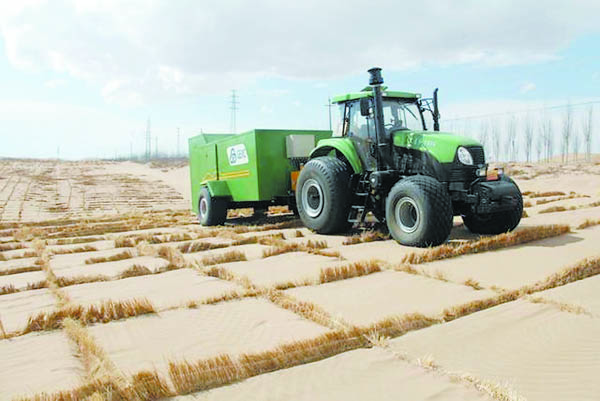 阻止沙漠化,首先要把臨近城鄉(xiāng)的沙漠固化。在武威,人們固化沙漠的方法是埋設(shè)草方格,草方格雖然有效,但人工每天只能埋設(shè)一畝,效率太低。甘肅建投副總經(jīng)理、裝備公司董事長(zhǎng)張志明,目睹沙漠侵襲的后果和鄉(xiāng)親們治沙的艱辛,他產(chǎn)生了研制治沙機(jī)的想法。2014年7月,張志明帶領(lǐng)團(tuán)隊(duì)設(shè)計(jì)制造出了世界首臺(tái)"立體固沙車",機(jī)械化治沙效率是人工治沙的50倍到80倍,并且"固沙車"可到達(dá)人類無法作業(yè)的沙漠腹地運(yùn)行,還可同步種植沙生植物,實(shí)現(xiàn)工程治沙與生物治沙相結(jié)合。