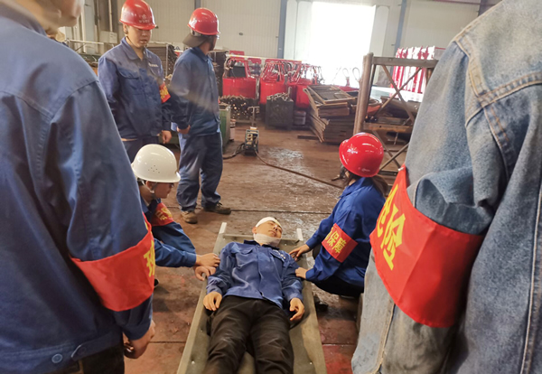上午9點(diǎn)40分演練開始,事故模擬發(fā)生在一車間生產(chǎn)線上,有1名作業(yè)人員被廠房掉落的隅撐砸中頭部昏迷。車間主任迅速趕往事故發(fā)生地點(diǎn)并向公司應(yīng)急救援總指揮報告事故情況,公司應(yīng)急救援總指揮接到電話,迅速趕赴現(xiàn)場,啟動緊急救援預(yù)案。調(diào)動各小組立即趕往事故現(xiàn)場,按照公司應(yīng)急救援預(yù)案開展救援,與此同時現(xiàn)場救援組立即將擔(dān)架抬至事故現(xiàn)場。通訊聯(lián)絡(luò)組立即模擬撥打120求救電話,后勤保障組攜帶止血繃帶、紗布、急救物品進(jìn)行應(yīng)急處理,讓"傷員"平躺,為防止有骨折,腿和手部加以臨時固定。接著運(yùn)輸車輛已等在門口,并通知醫(yī)院急救室做好接待傷員準(zhǔn)備。九點(diǎn)五十分,車輛出發(fā),救護(hù)組陪同,開往醫(yī)院。